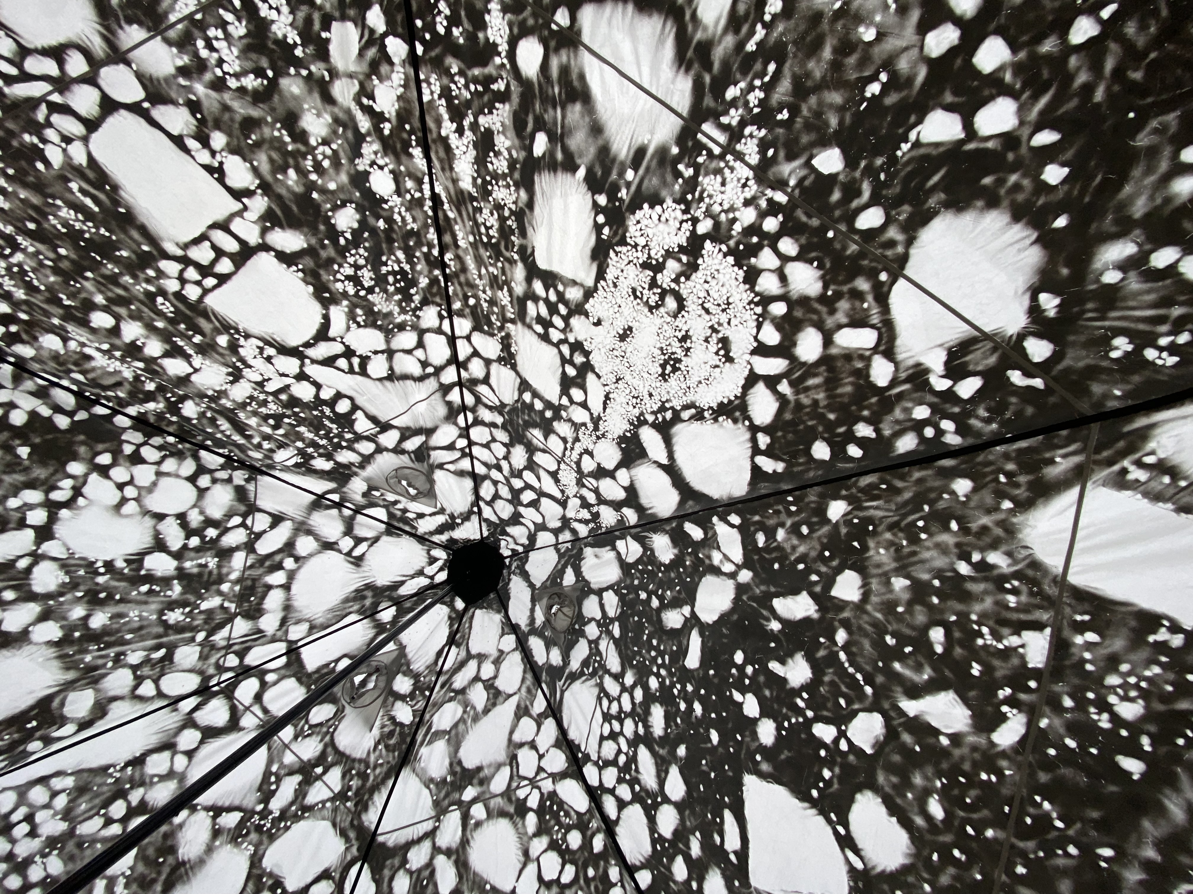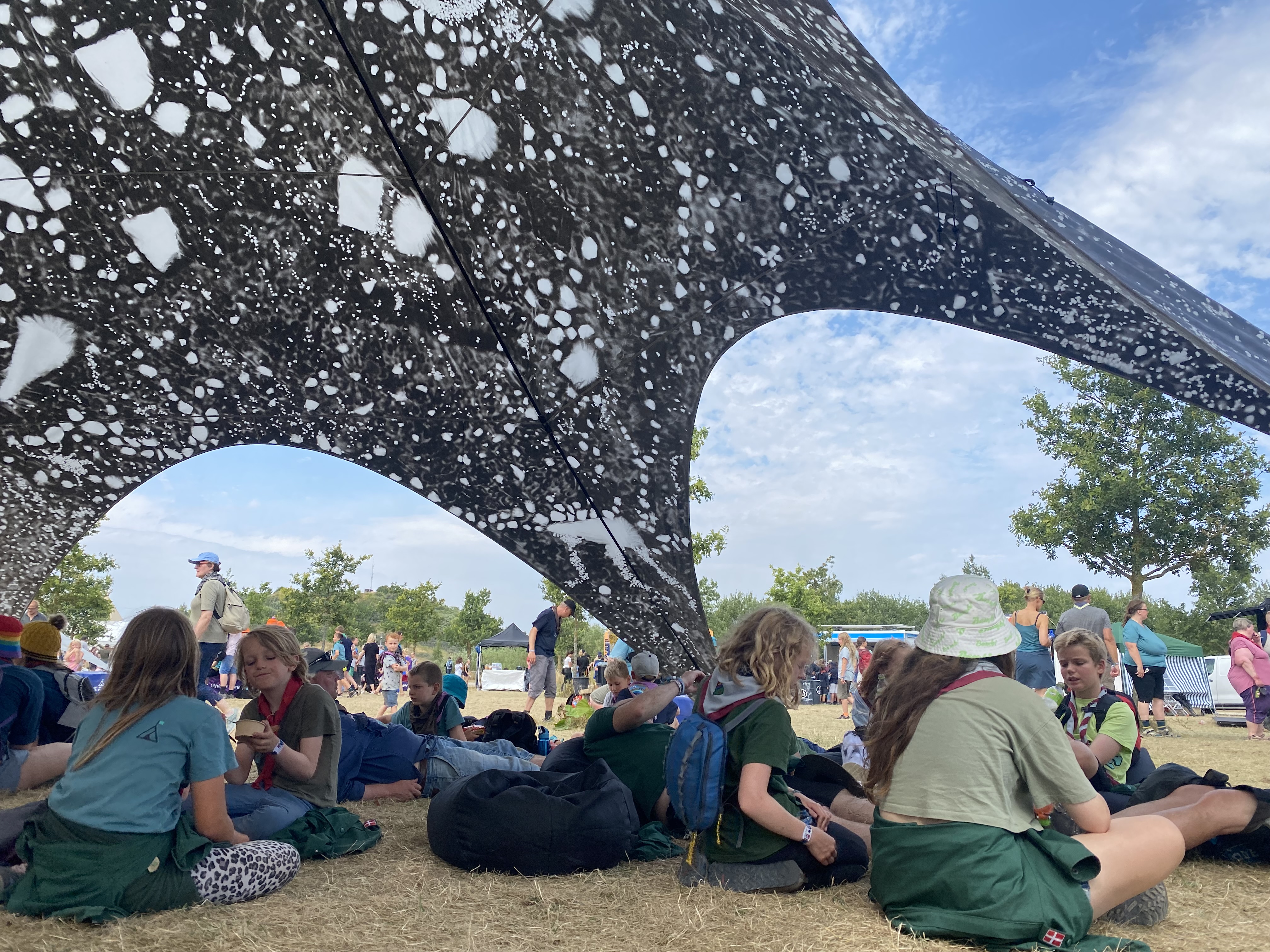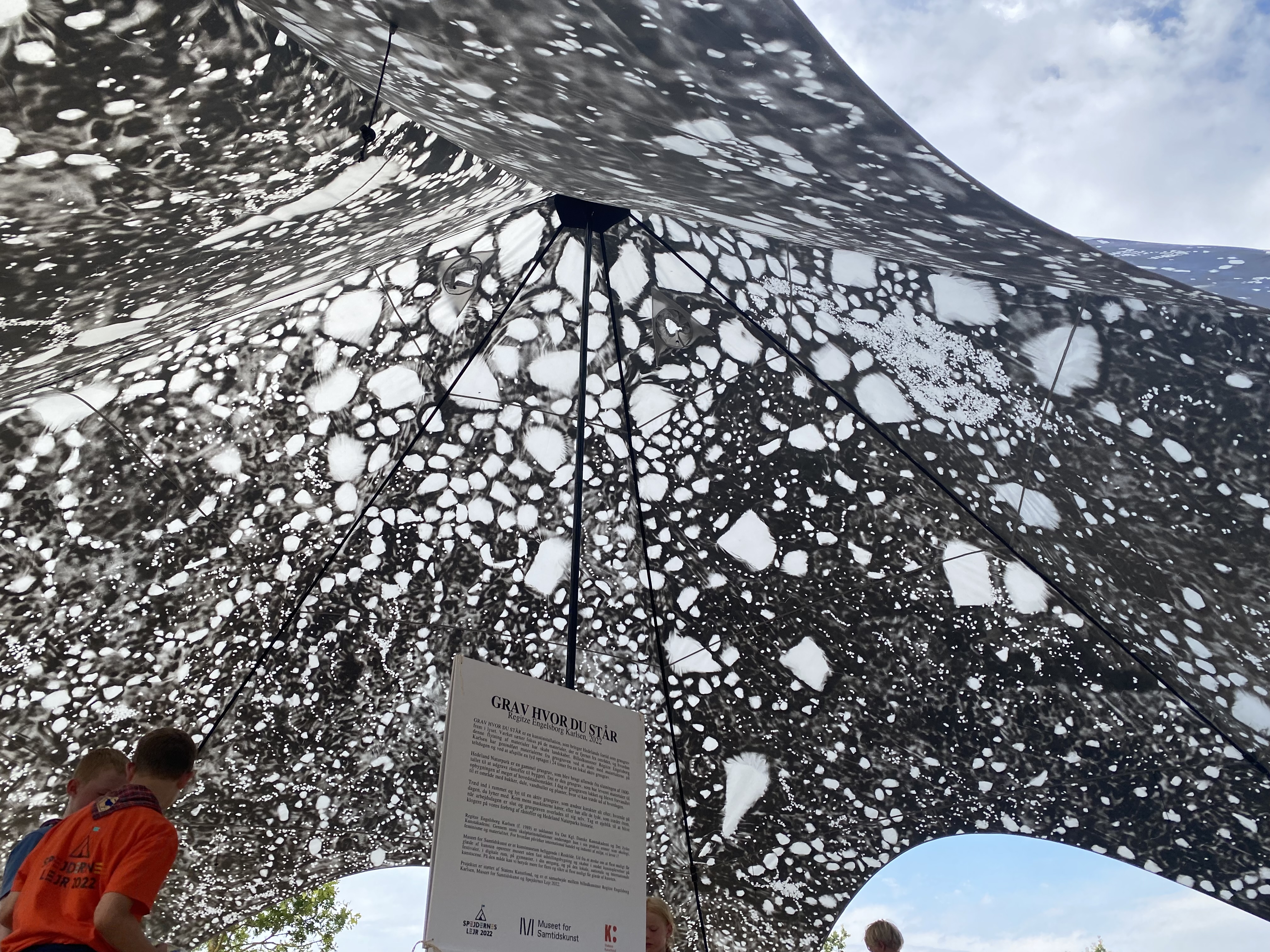 DIG WHERE YOU STAND is art installation that brings the active gravel pit back to Hedeland Nature Park. The work focuses on the materials that have been removed from the area and how this movement of materials has created the landscape. Visual artist Regitze Engelsborg Karlsen has reintroduced the materials from the gravel pit by putting their imprint on the tent cloth and by recording 24 hours from a local active gravel pit.